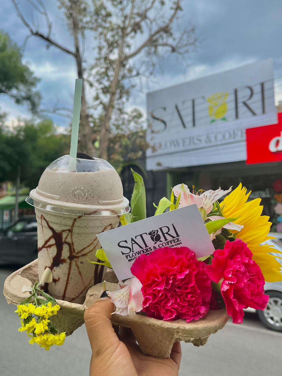Frappe sabor a elegir fav+ ramo chico puede incluir gerbera, lily, girasol o dalia según existencia+ clavel y follaje.