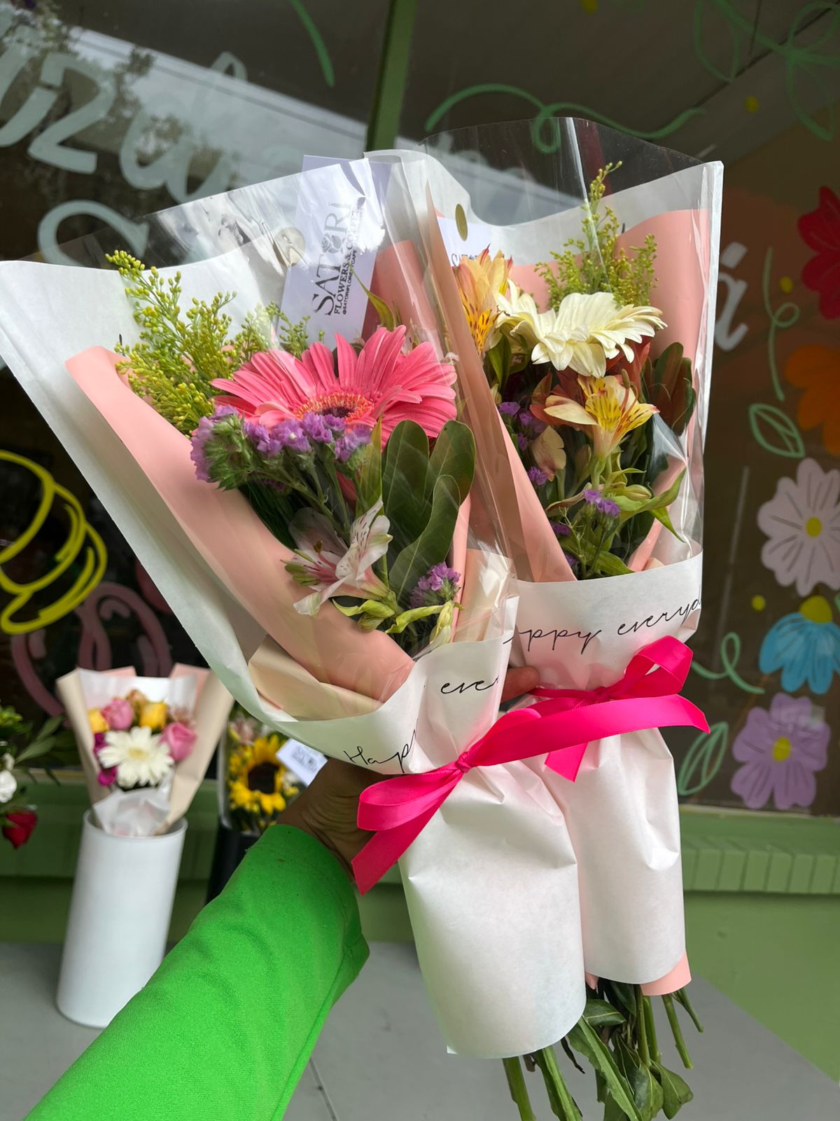 RAMO Individual Gerbera Follaje Envoltura y Lazo.