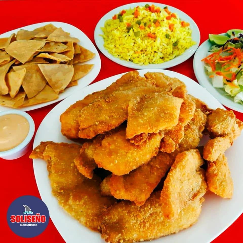 Filete empanizado dorado al momento, acompañado de papas fritas, arroz, aderezo y agua fresca de limón, jamaica o tamarindo.