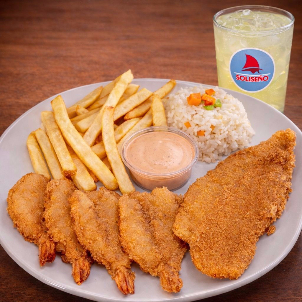 La combinación perfecta de filete y camarón empanizado, con papas fritas, arroz, aderezo y agua fresca de limón, jamaica o tamarindo.