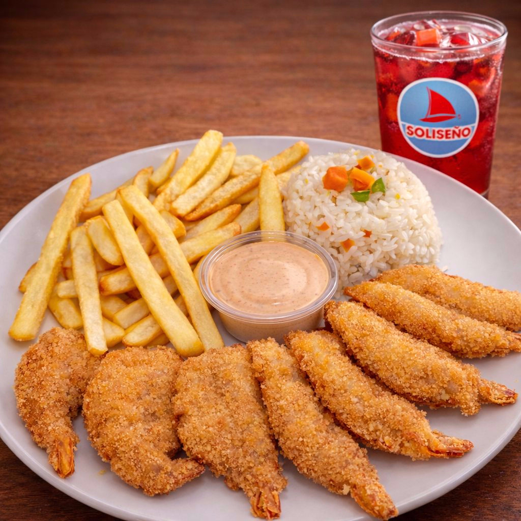 Camarones empanizados crujientes, servidos con papas fritas, arroz, aderezo y agua fresca de limón, jamaica o tamarindo.