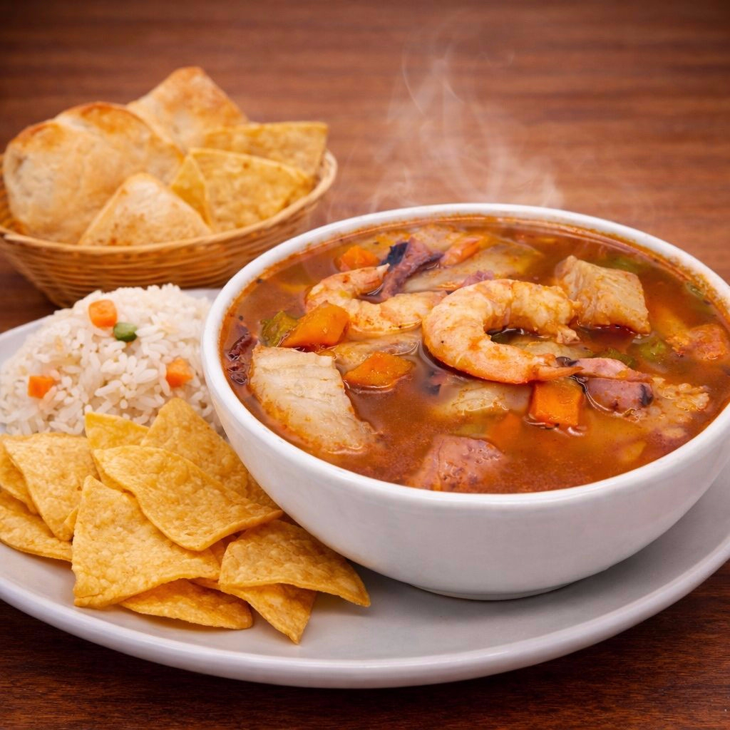 Exquisito y calientito caldo de sopa de mariscos, incluye arroz amarillo porción y totopos, limón.