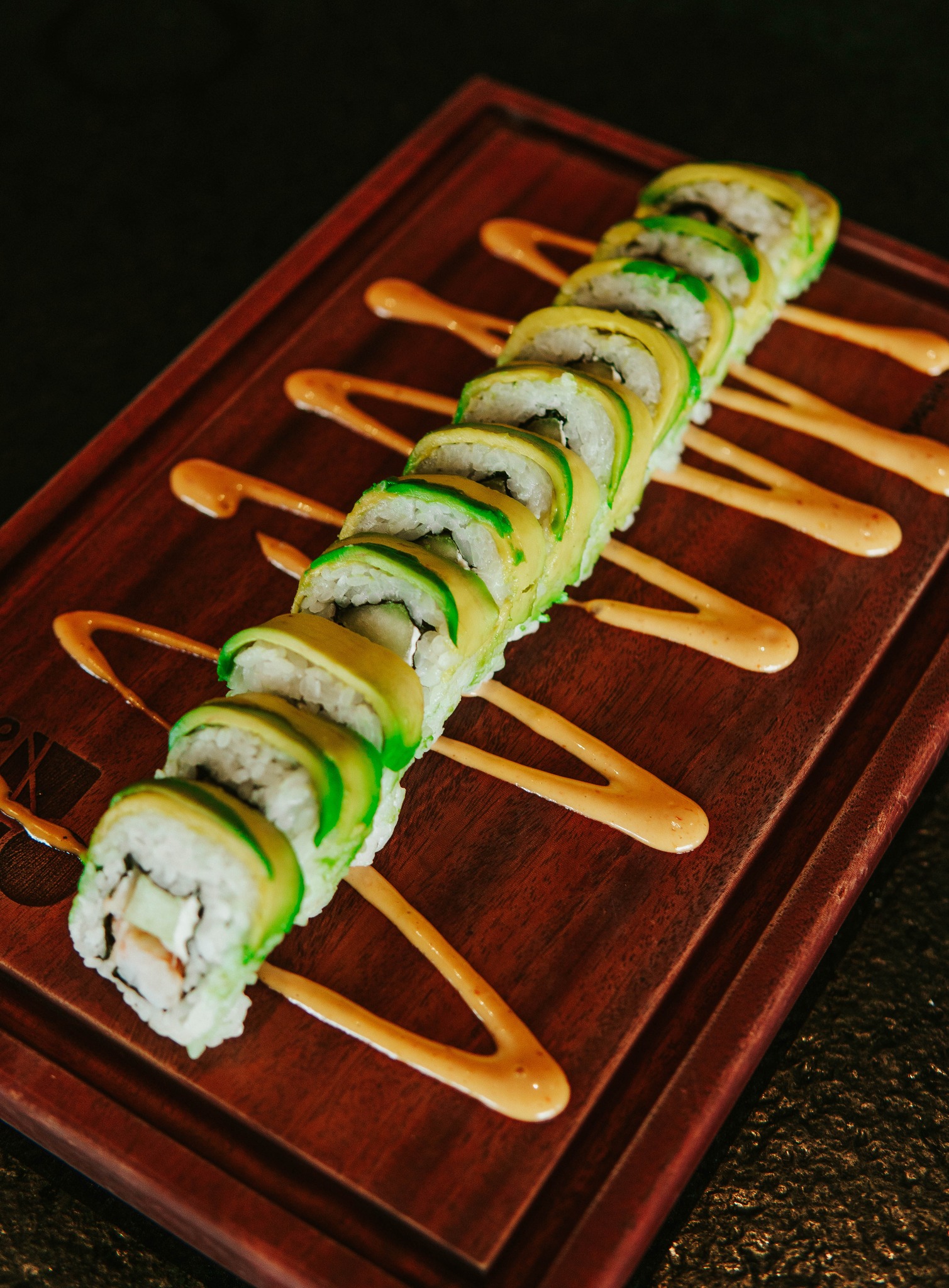 Anguila, aguacate y philadelphiapor dentro, cangrejo por fuera, capeado con pasta tampico arriba, salsa de anguila y ajonjolí.