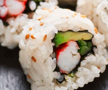 Pasta de cangrejo, aguacate, pepino por dentro, ajonjolí por fuera.