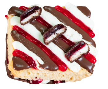Pan chocolate, salseado con jarabe de chocolate, relleno de crema Suspiros y cubierto con betún de chocolate, una deliciosa combinación de chocolate ganache oscuro y espirales de ganache blanco con una cereza al centro.