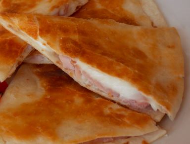 2 Tortillas de Harina de 20 CM ligeramente doradas en mantequilla con queso Chihuahua rellenas con jamón o chorizo o deshebrada.