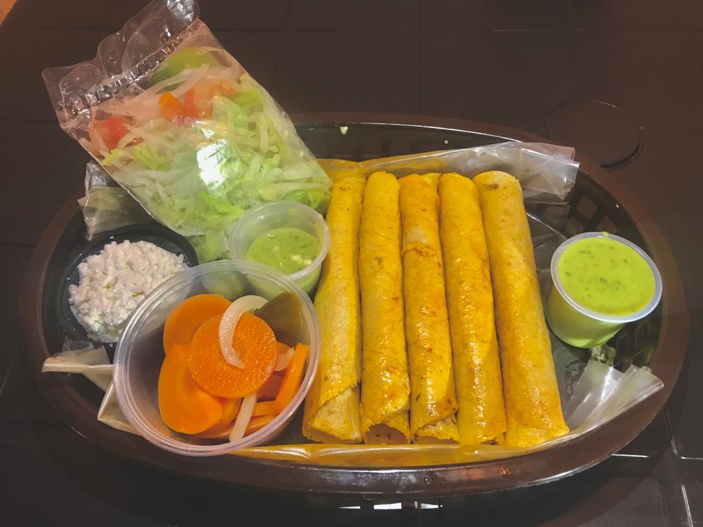 Orden con 5 Tacos en Tortillas de Maíz Enrollados "Doraditos Crujientes" Rellenos de 100% Carne Deshebrada.
