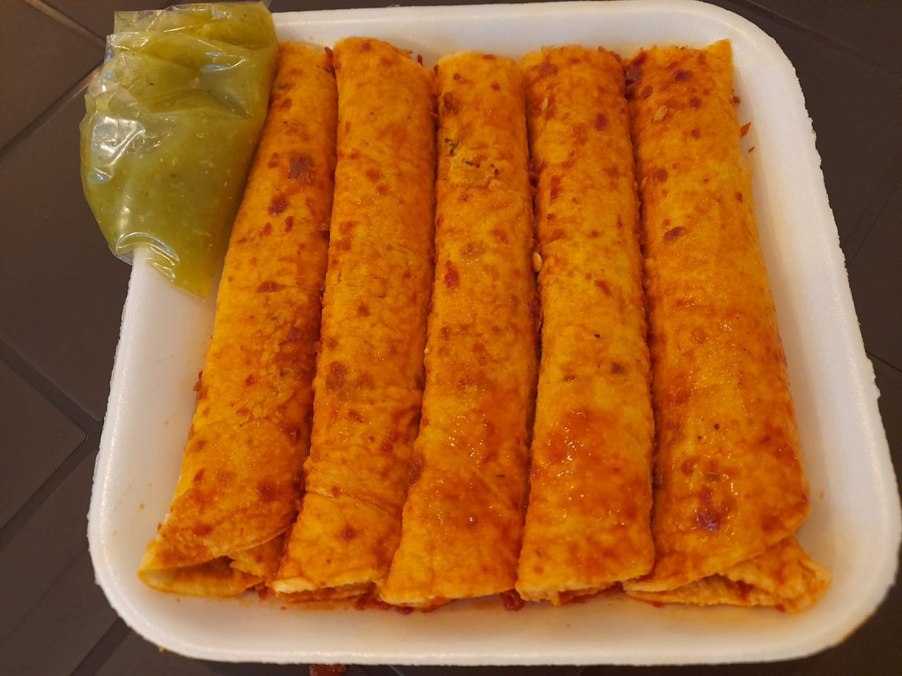 Orden con 5 TACOS en Tortilla de Maiz Enrollados, rellenos de 100% Carne DESHEBRADA Guisada. Incluye Salsa.