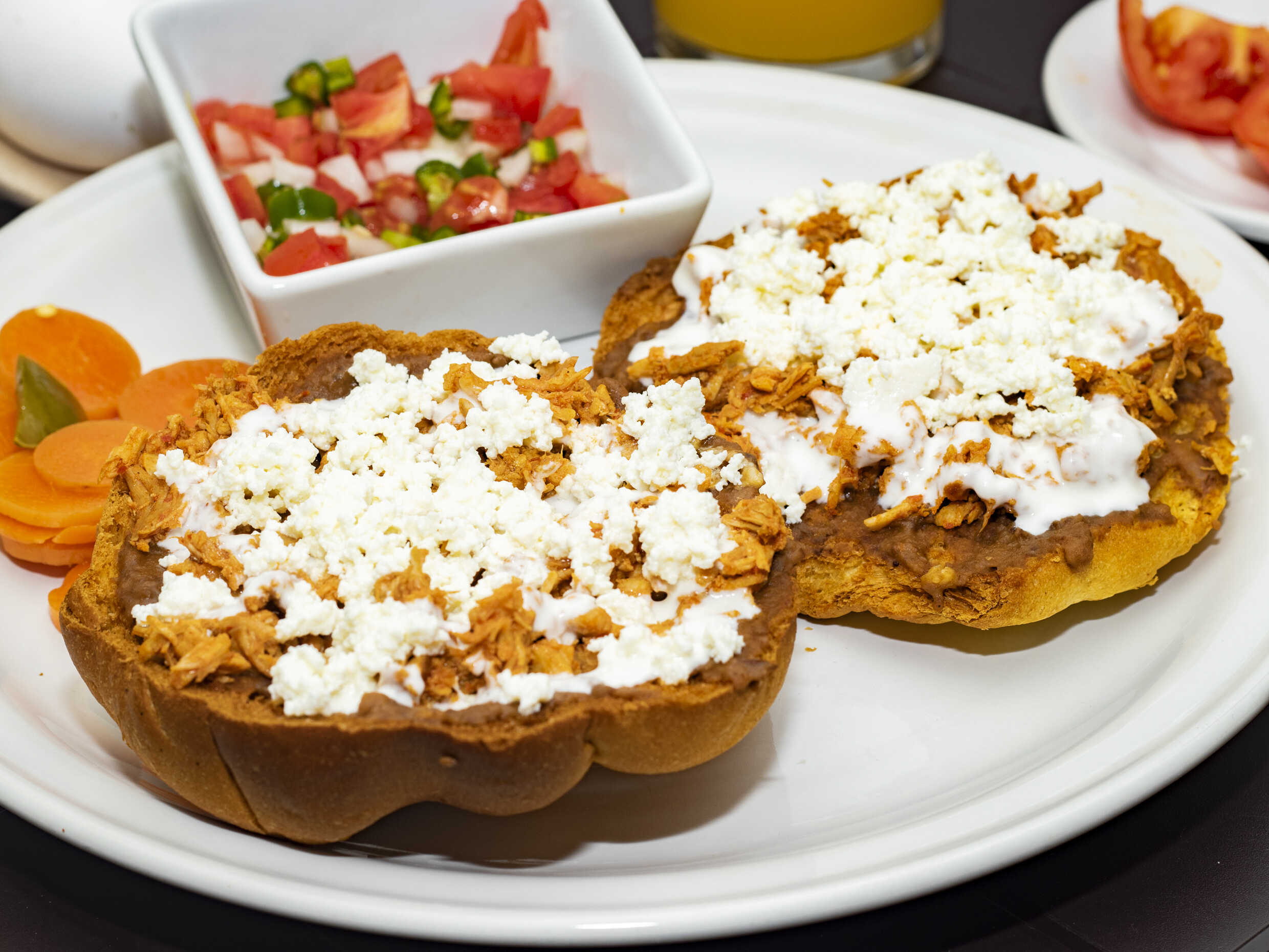 Dos panes tostados con frijoles, queso fresco o chihuahua y pico de gallo. Pueden Tradicionales, con Chorizo o Deshebrada.