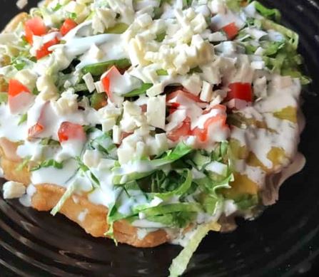 Deliciosa Migada al estílo Taco Roll. Riquísima masa frita en Base de Frijol, Guiso, lechuga, tomate cebolla crema, queso y Aguacate.