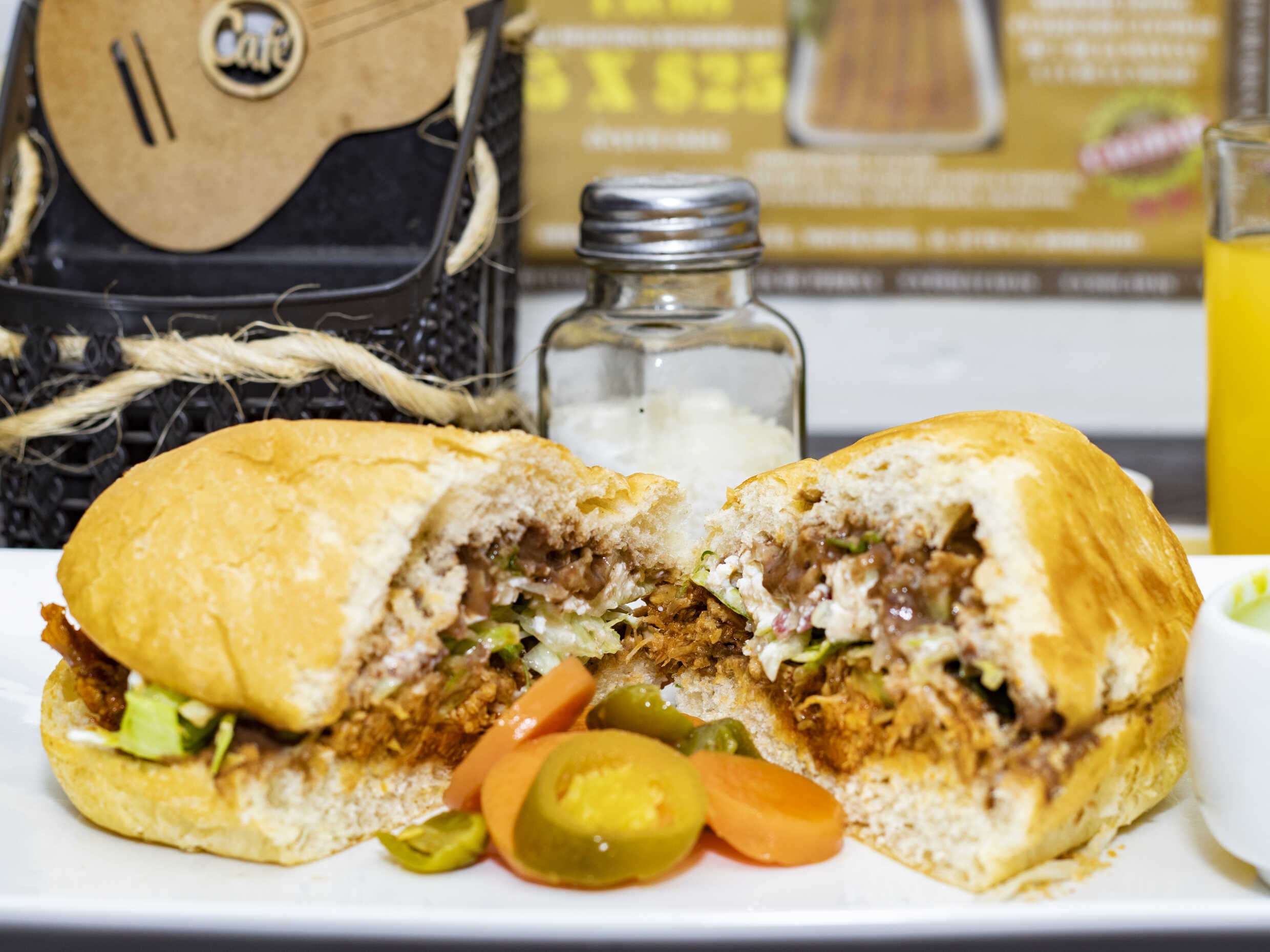 Elaborada con frijol negro, cochinita, salsa habanera, aguacate, lechuga, tomate, zanahorias encurtidas, salsa y cebolla. Elaborada con Pan Artesanal.