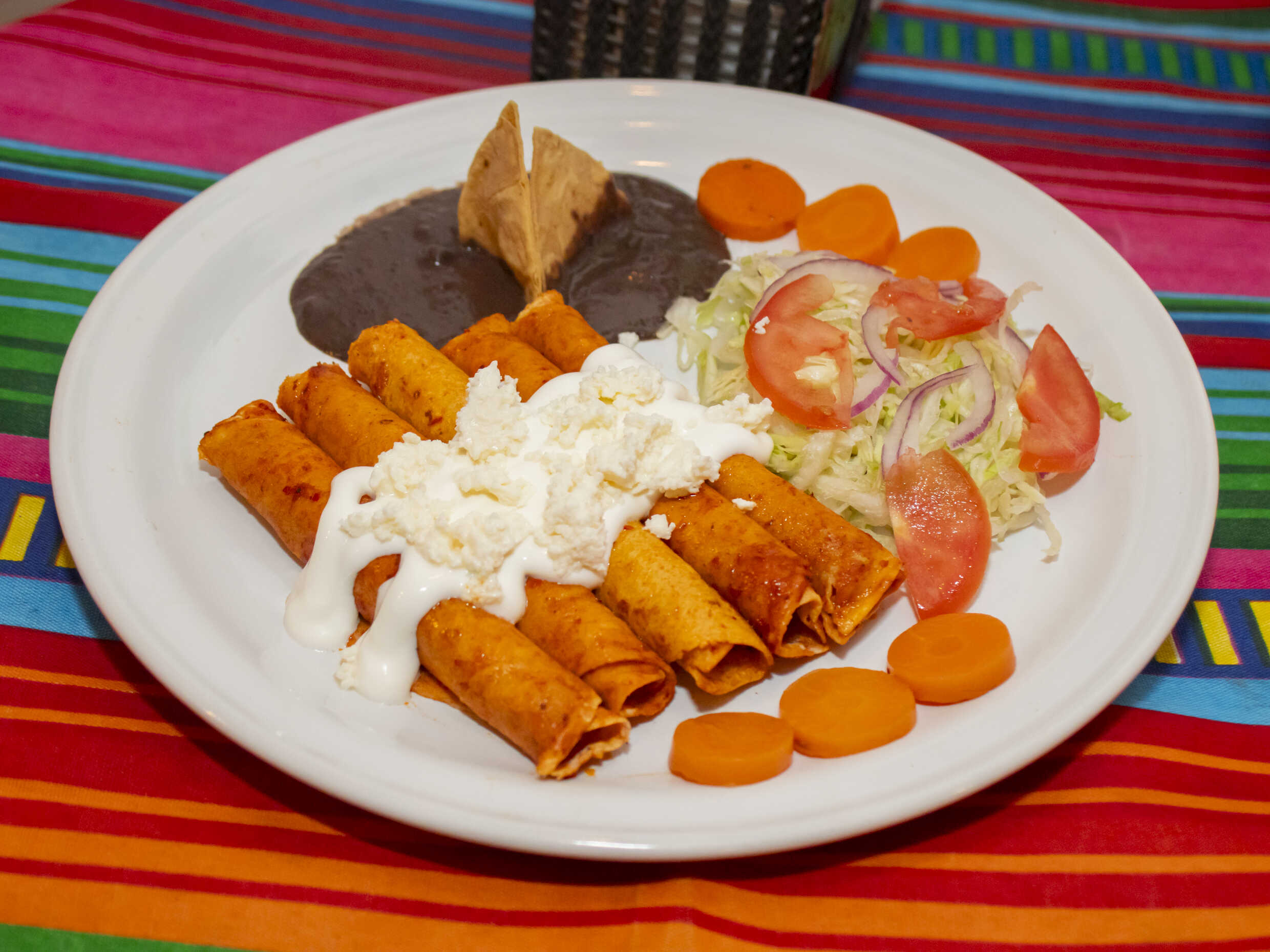 5 Tacos Blanditos de Deshebrada acompañados de Ensalada (de lechuga con tomate, cebolla y limón), *Frijoles Guisados, *Crema Natural, *Queso Fresco, *Zanahorias Encurtidas.
