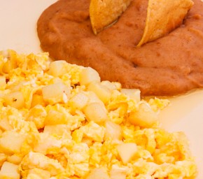 Revueltos bañados en salsa de tomate y y una deliciosa porción de frijoles refritos.. Incluyen 5 tortillas de Maíz y salsa.
