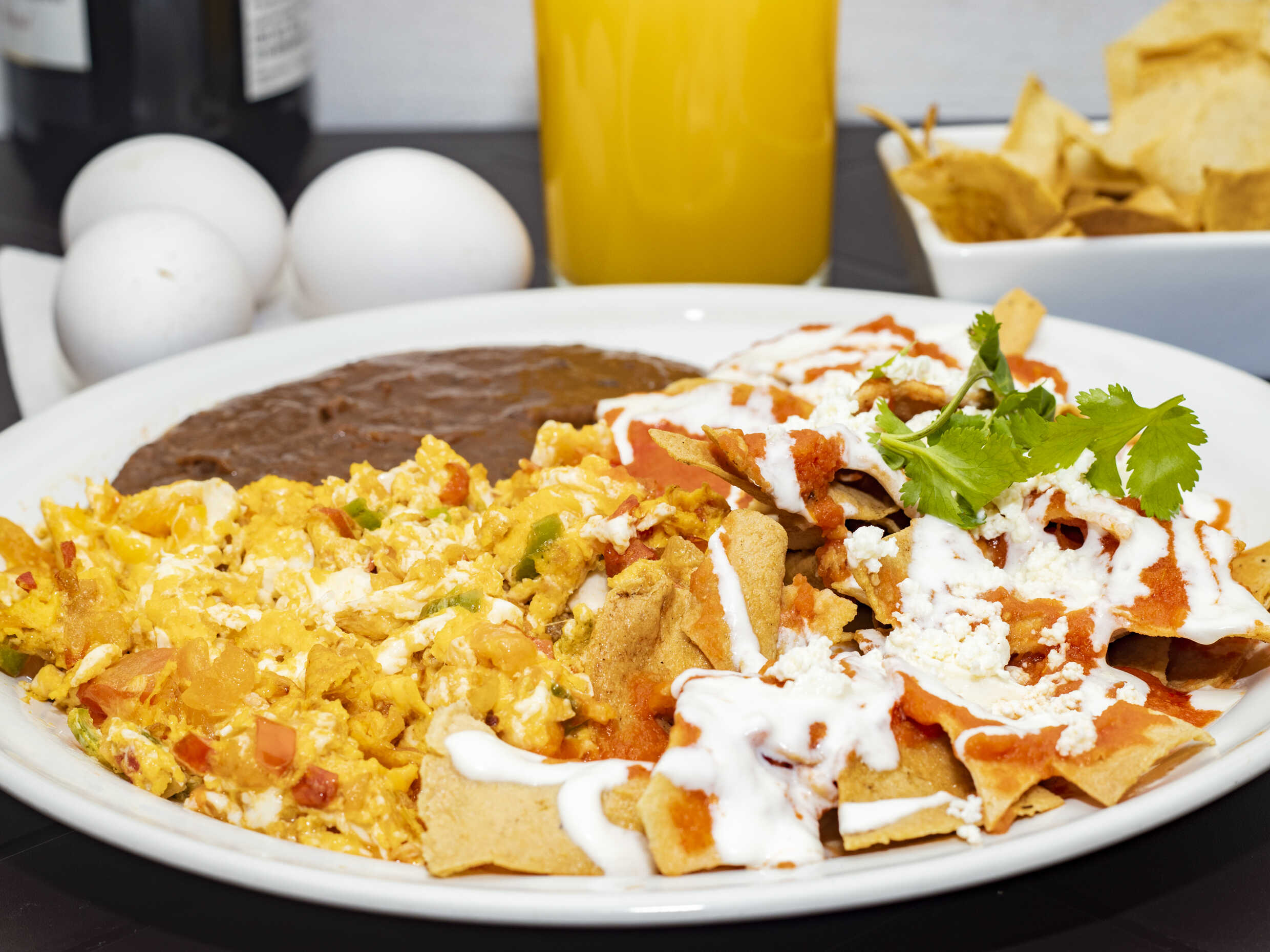 Chilaquiles rojos con deshebrada, queso fresco y crema y con 2 huevos revueltos con salsa de chile verde.