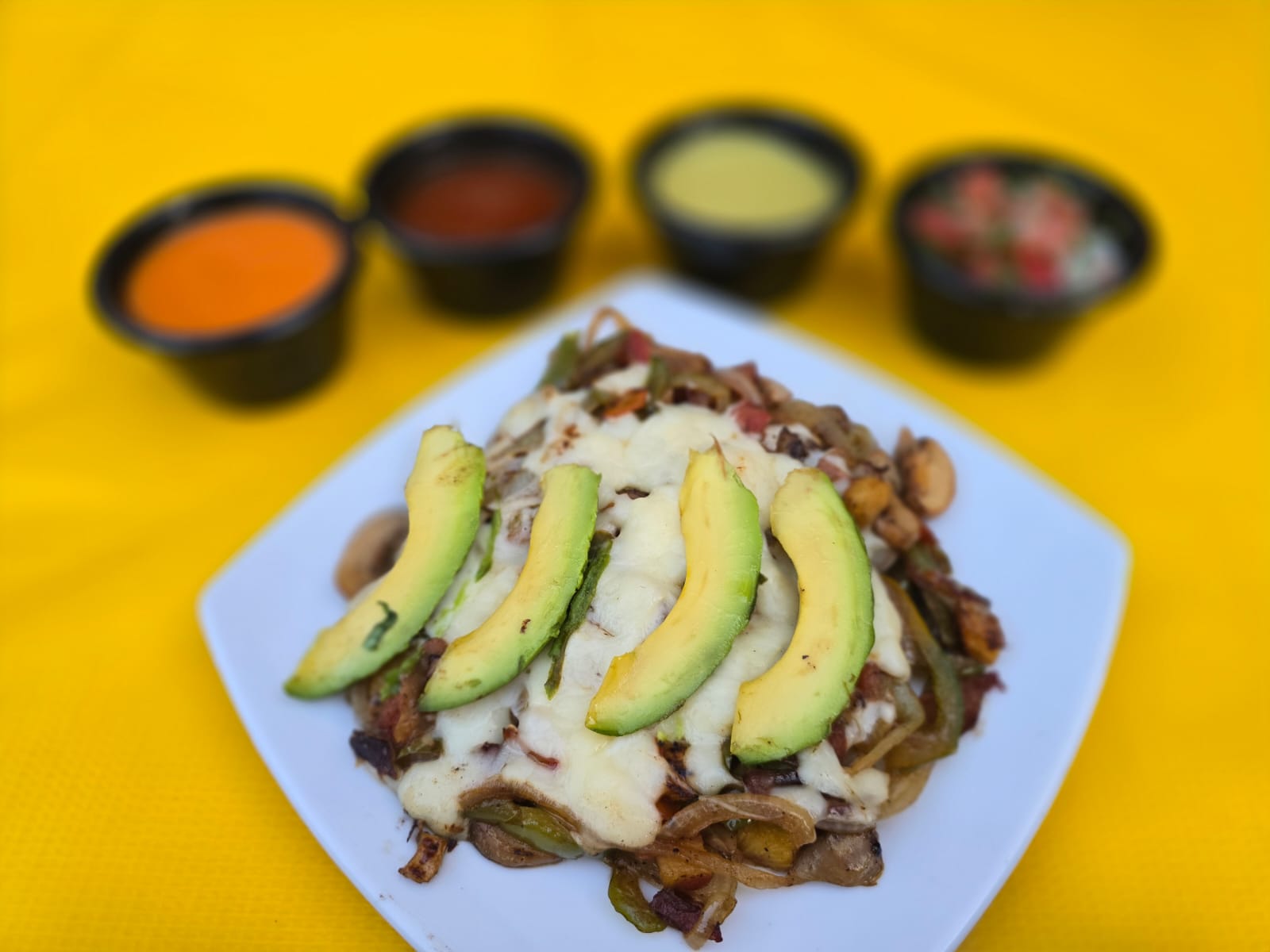 Deliciosa torta de fajita, cebolla, tomate, aguacate y queso asadero.