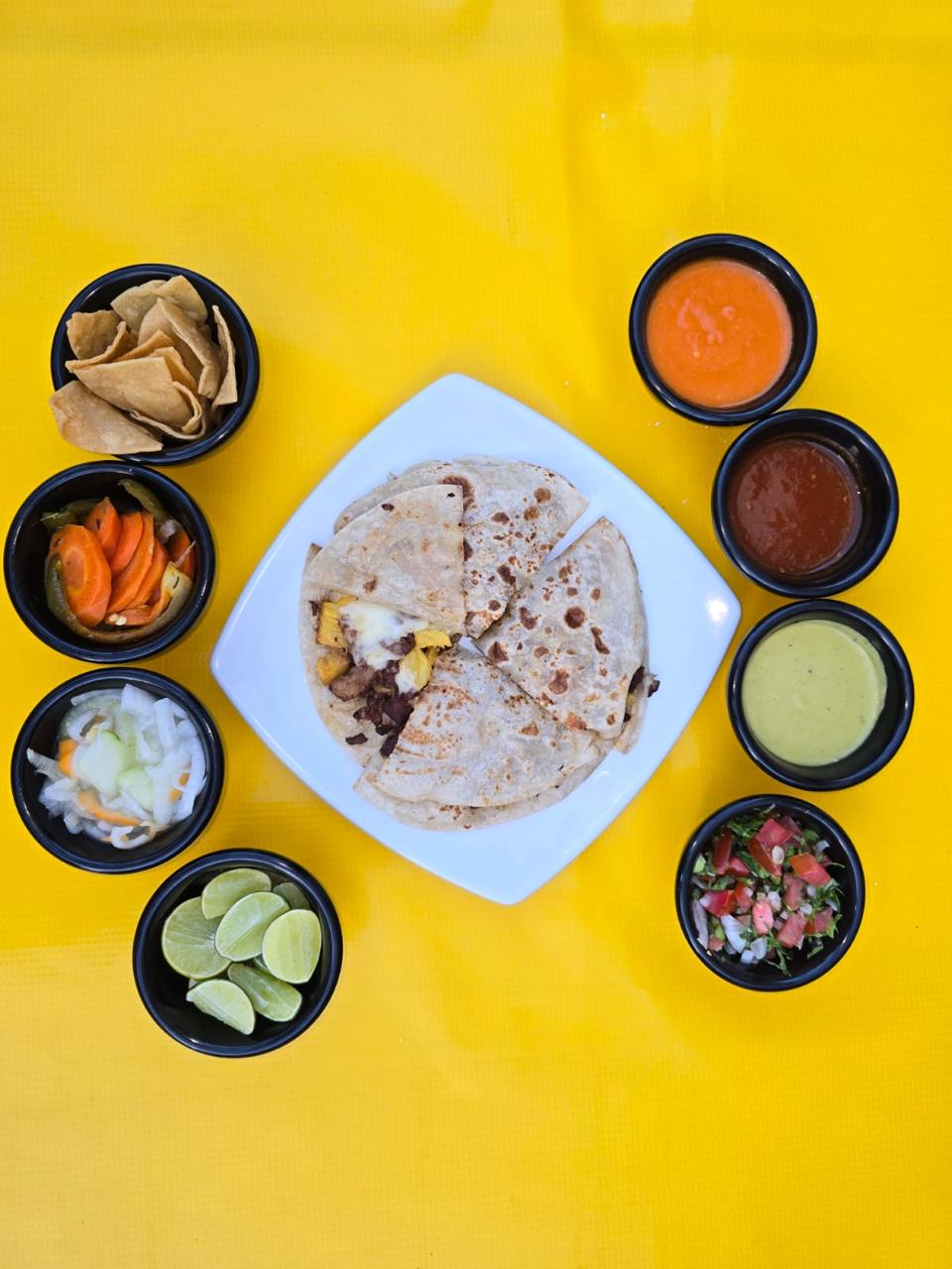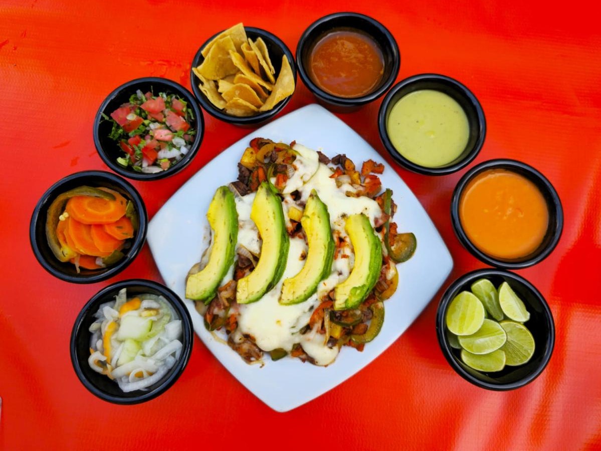 Jamón, tocino, cebolla, morrón, piña, tomate, champiñones, aguacate y queso asadero (platillo para 2 personas, incluye 20 tortillas de maíz).