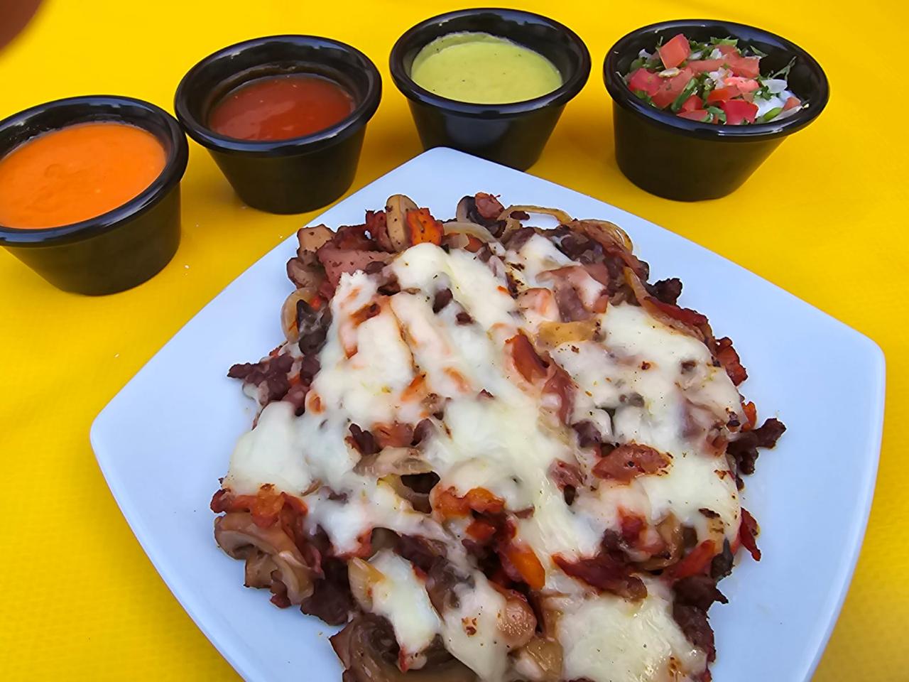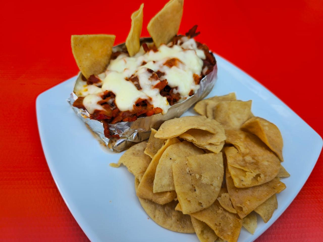 Deliciosa papa asada con carne al bistec, queso amarillo, crema, totopos y queso asadero.