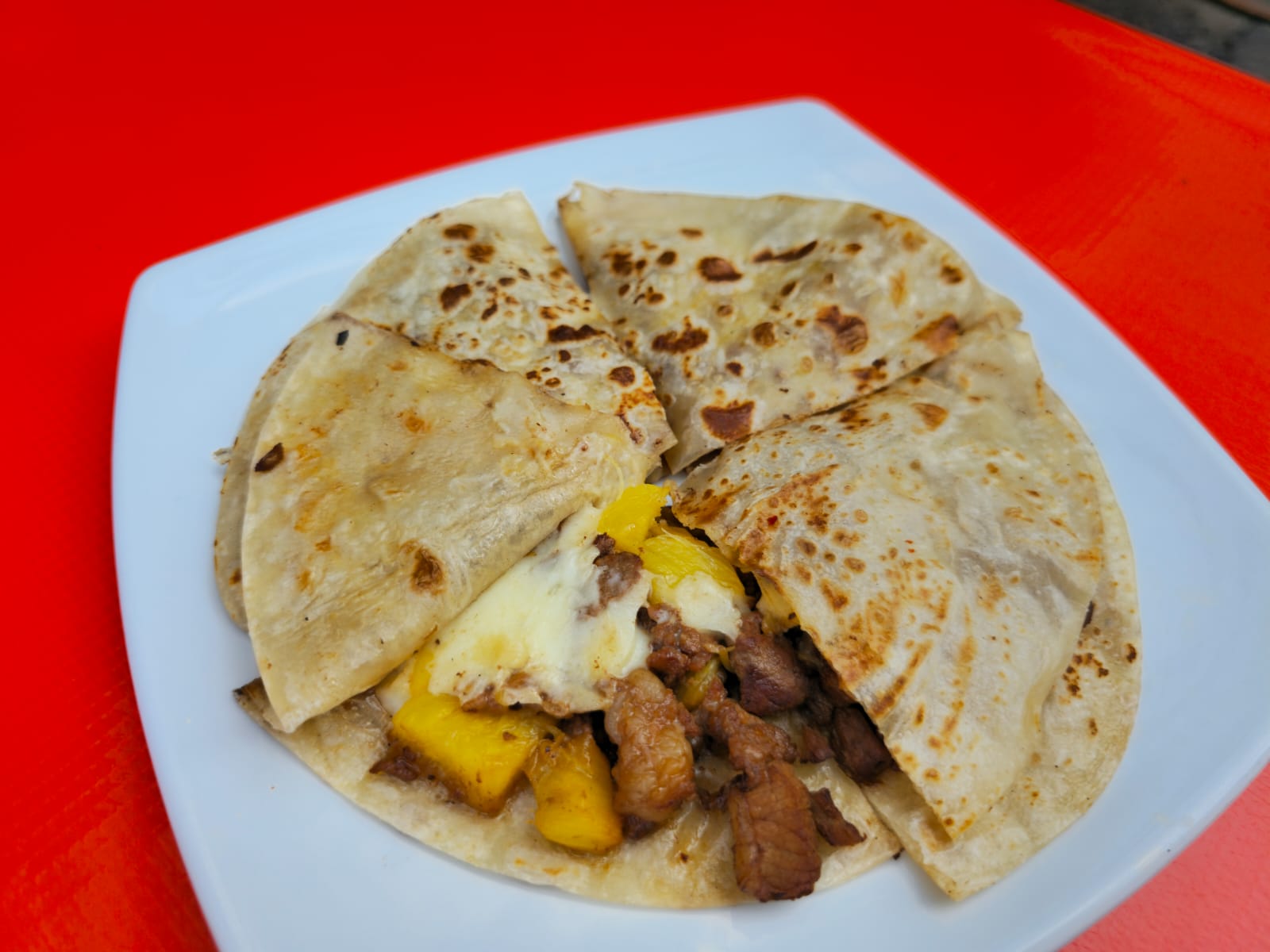 Tortilla de harina, queso amarillo y jamón, partida en 4 partes.