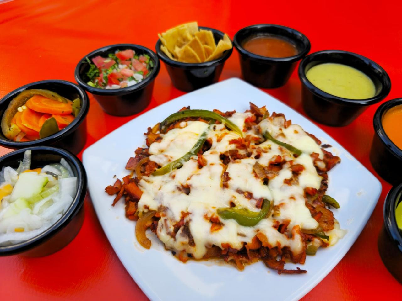 Bistec, pastor, jamón, tocino, cebolla, queso, champiñones (platillo para 2 personas, incluye 20 tortillas de maíz).
