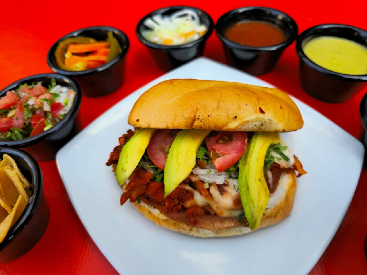 Deliciosa torta de pastor, cebolla, tomate, aguacate y queso asadero.
