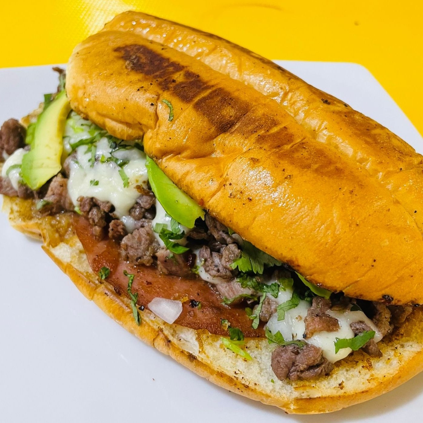 Deliciosa torta de bistec, cebolla, tomate, aguacate y queso asadero.