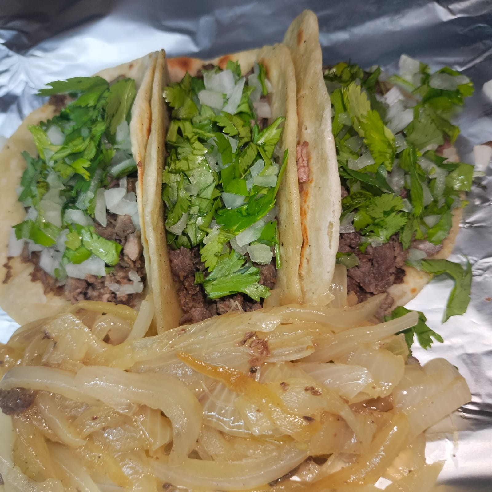 Delicioso taco de bistec con cebolla cruda y cilantro.