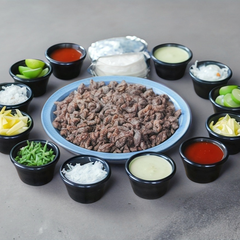 1 kg de bistec acompañado de 40 tortillas de maíz, cebolla, cilantro, limón, salsa roja y verde.