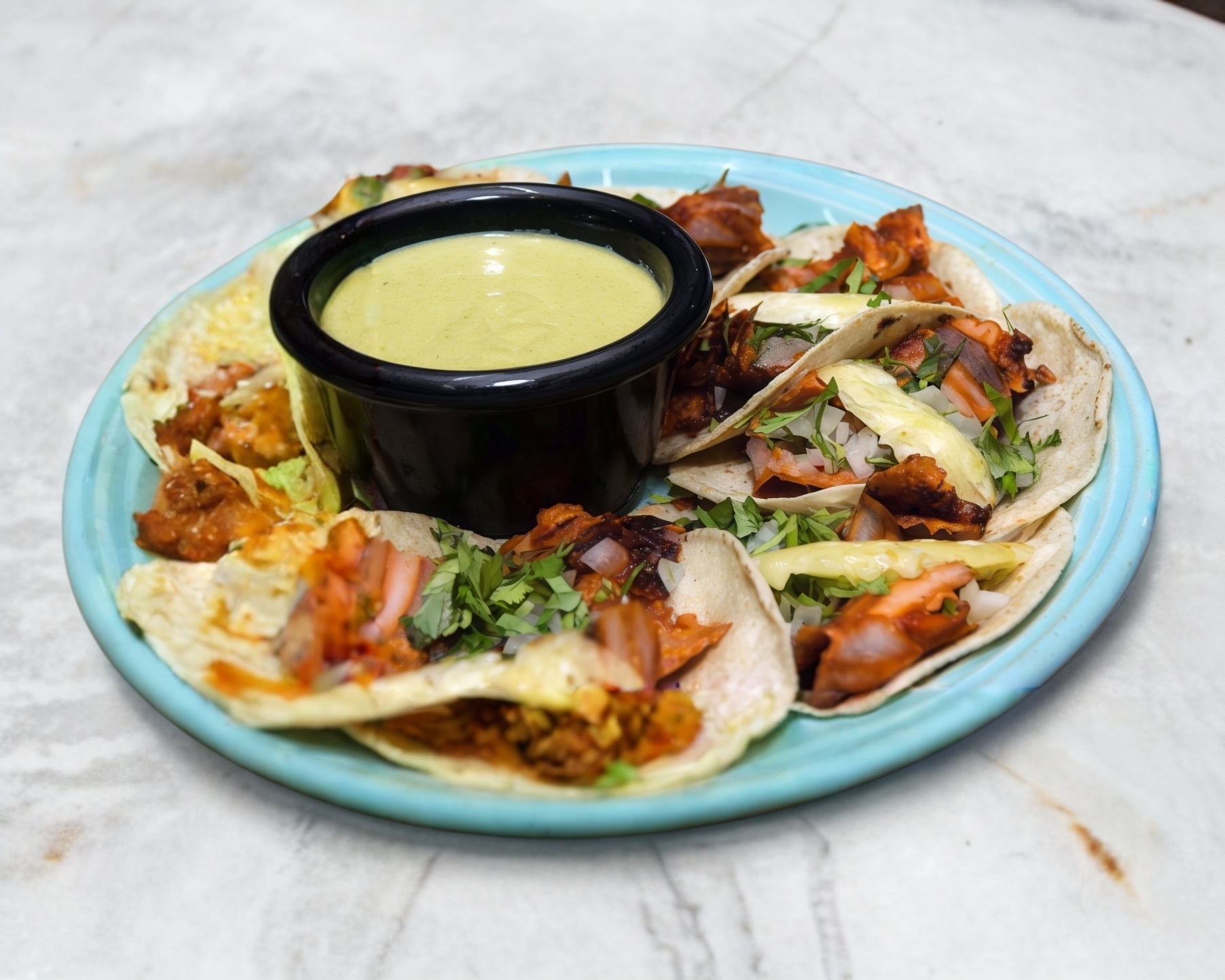 Orden de 5 tacos al pastor en tortilla de maíz con queso, cebolla y cilantro.