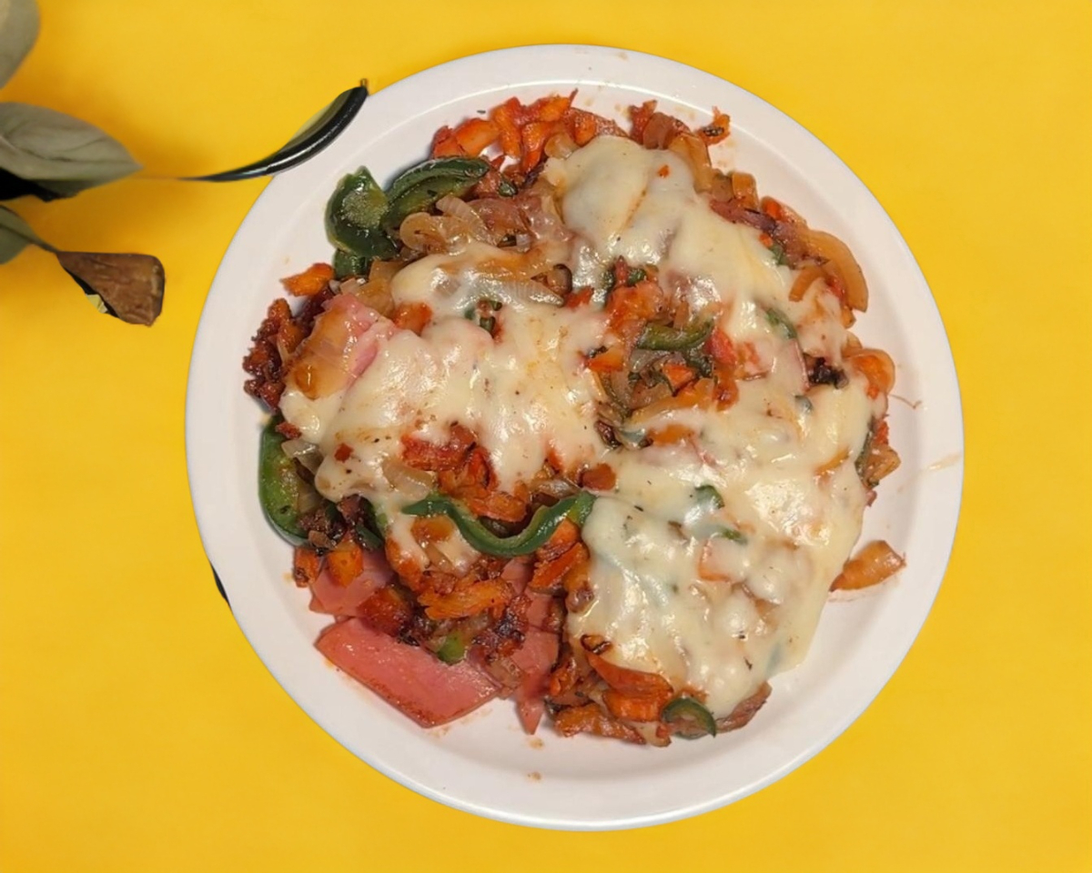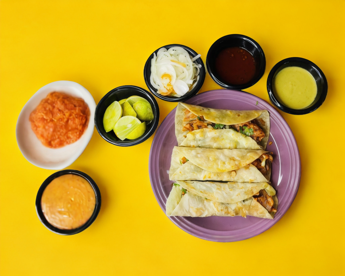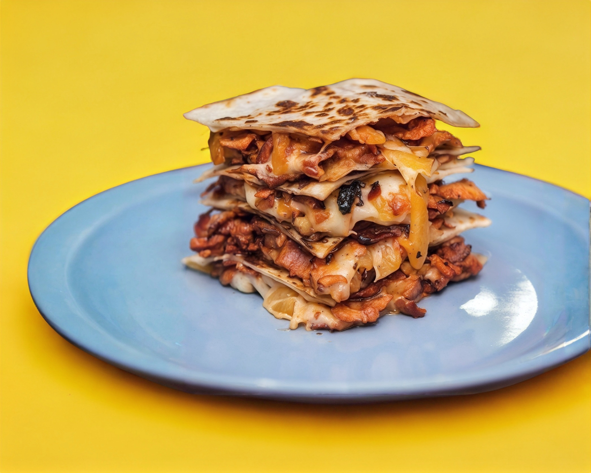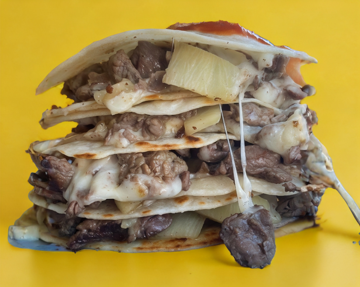 Carne al pastor, piña y queso gratinado en dos tortillas de harina.