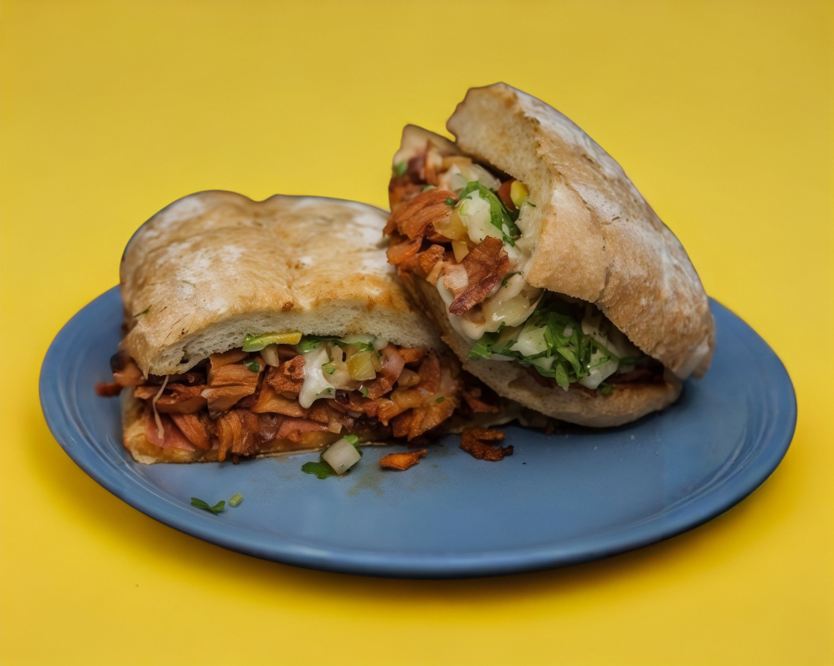 pan torreón con carne al pastor, jamón, queso, mayonesa, cebolla, cilantro, tomate y aguacate