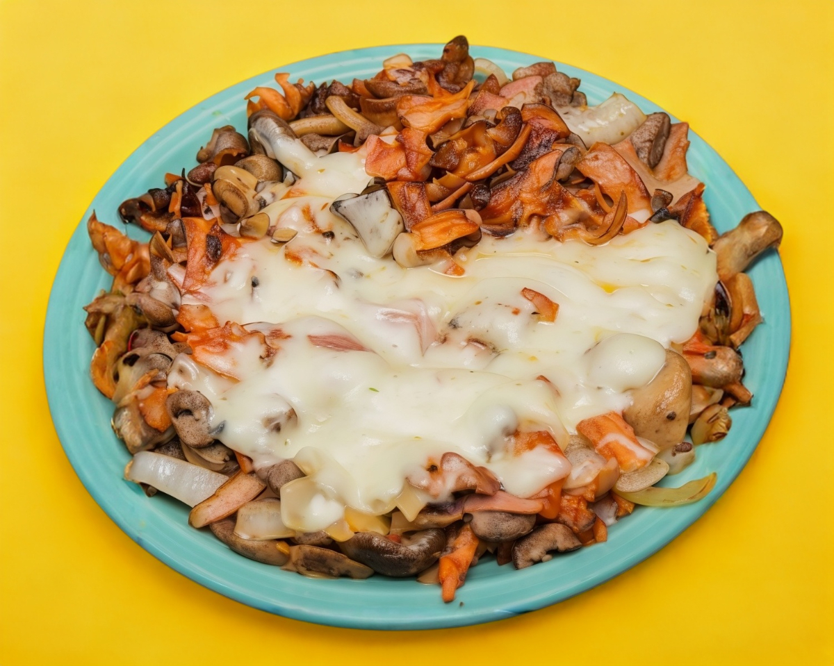 Queso gratinado con champiñones en trocitos en medio de dos tortillas de harina