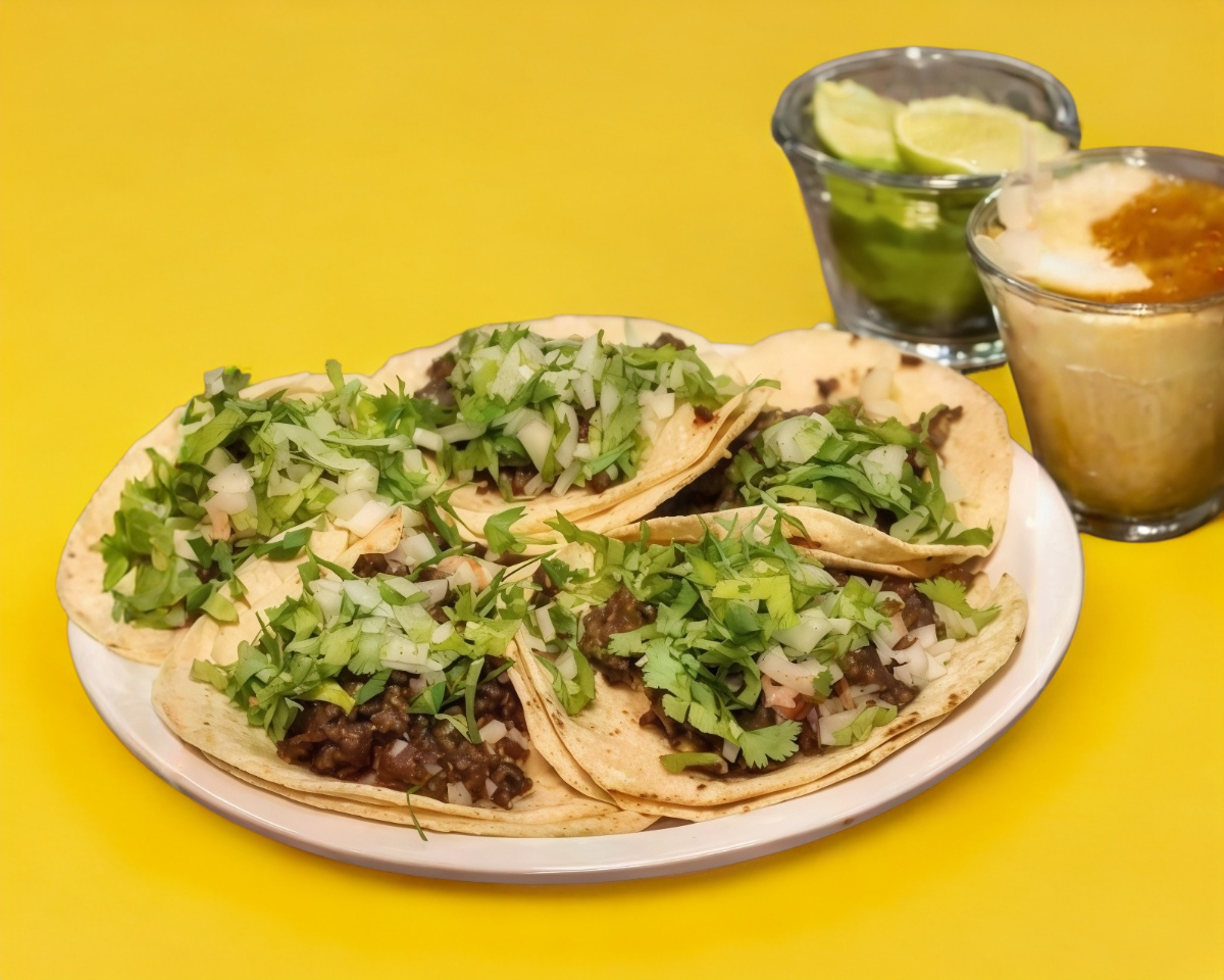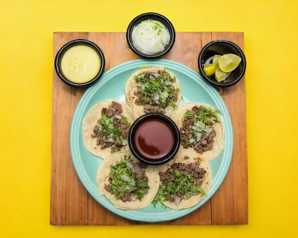 Orden de 5 taco de bistec en tortilla de maíz con queso, cebolla y cilantro.