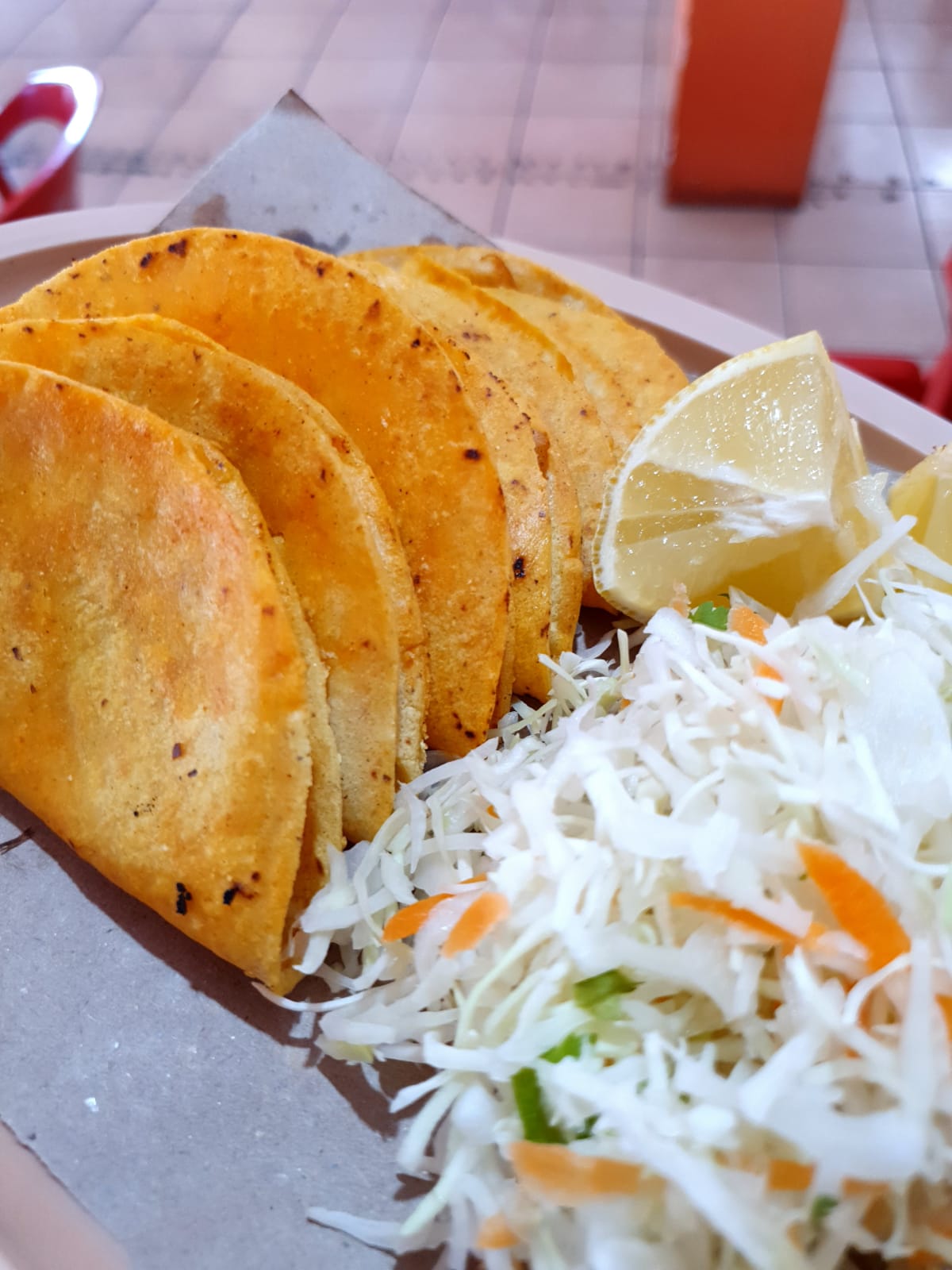 Acompañado de ensalada de repollo ,salsa, limones, crema y sal. Calentado a la plancha.
