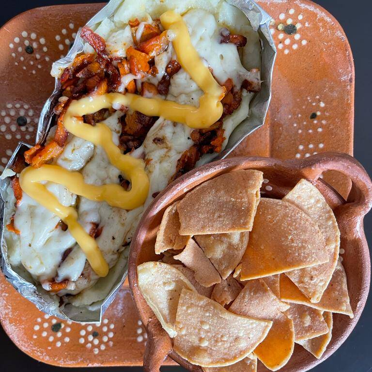 Papa Asada preparada al momento acompañada de pastor.
