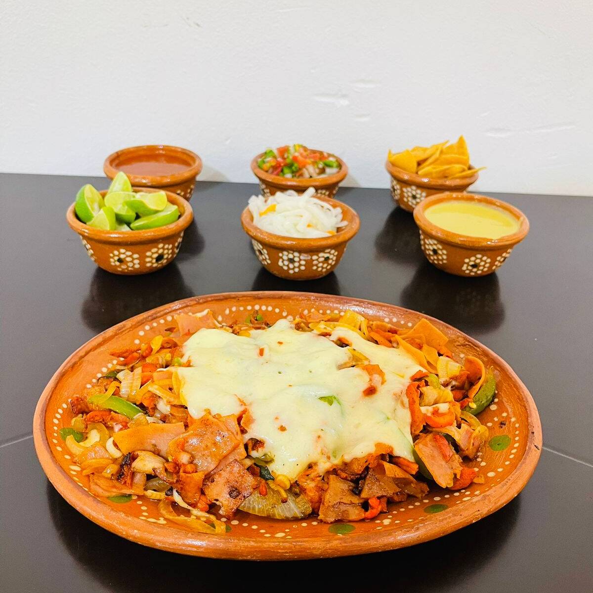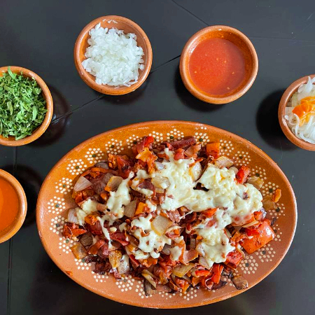 Platillo elaborado y acompañado con carne de pastor, carne de bistec, cebolla, champiñones, jamón, tocino, queso y su porción de torillas.
