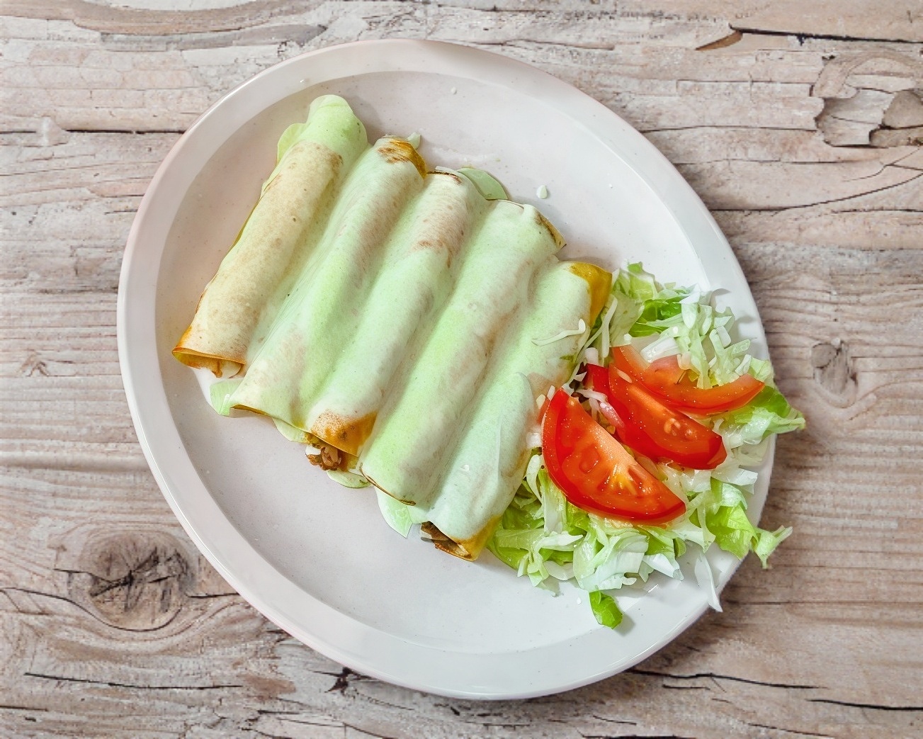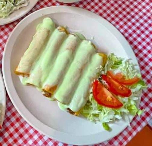 Tortilla de maíz con carne deshebrada natural y cremas acompañado de lechuga y tomate.