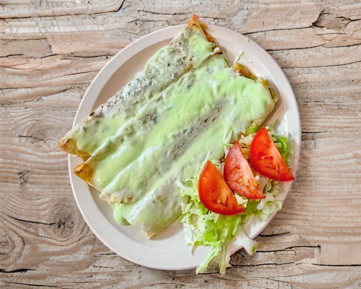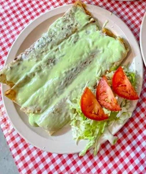 Tortilla de harina con guiso y cremas acompañada de lechuga y tomate.