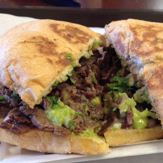 Pan, mayonesa, asada, cebolla, cilantro, aguacate.