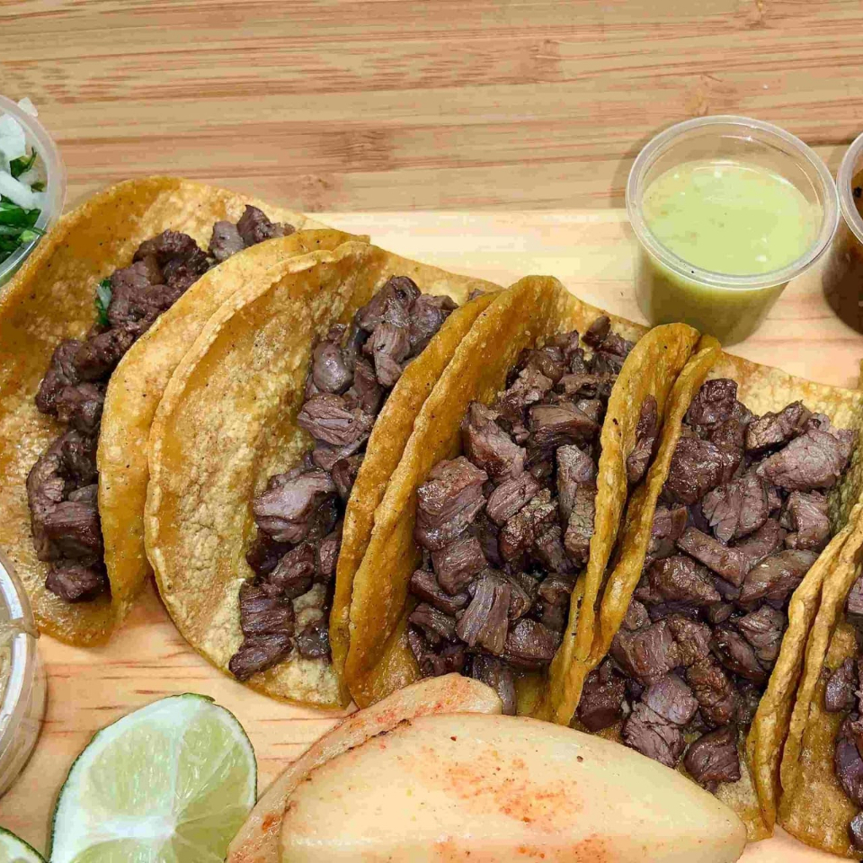 Tortilla de harina, pastor, queso, cebolla, cilantro, aguacate.