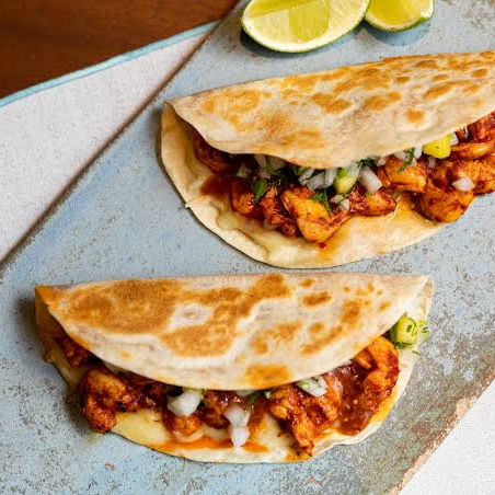 Tortilla de harina, asada, queso, cebolla, cilantro, aguacate.