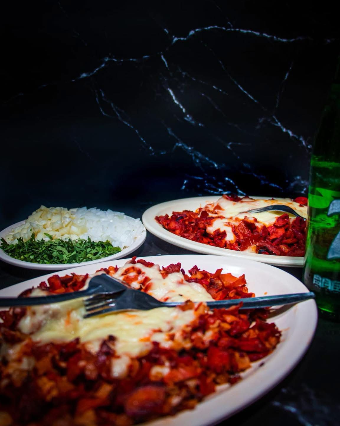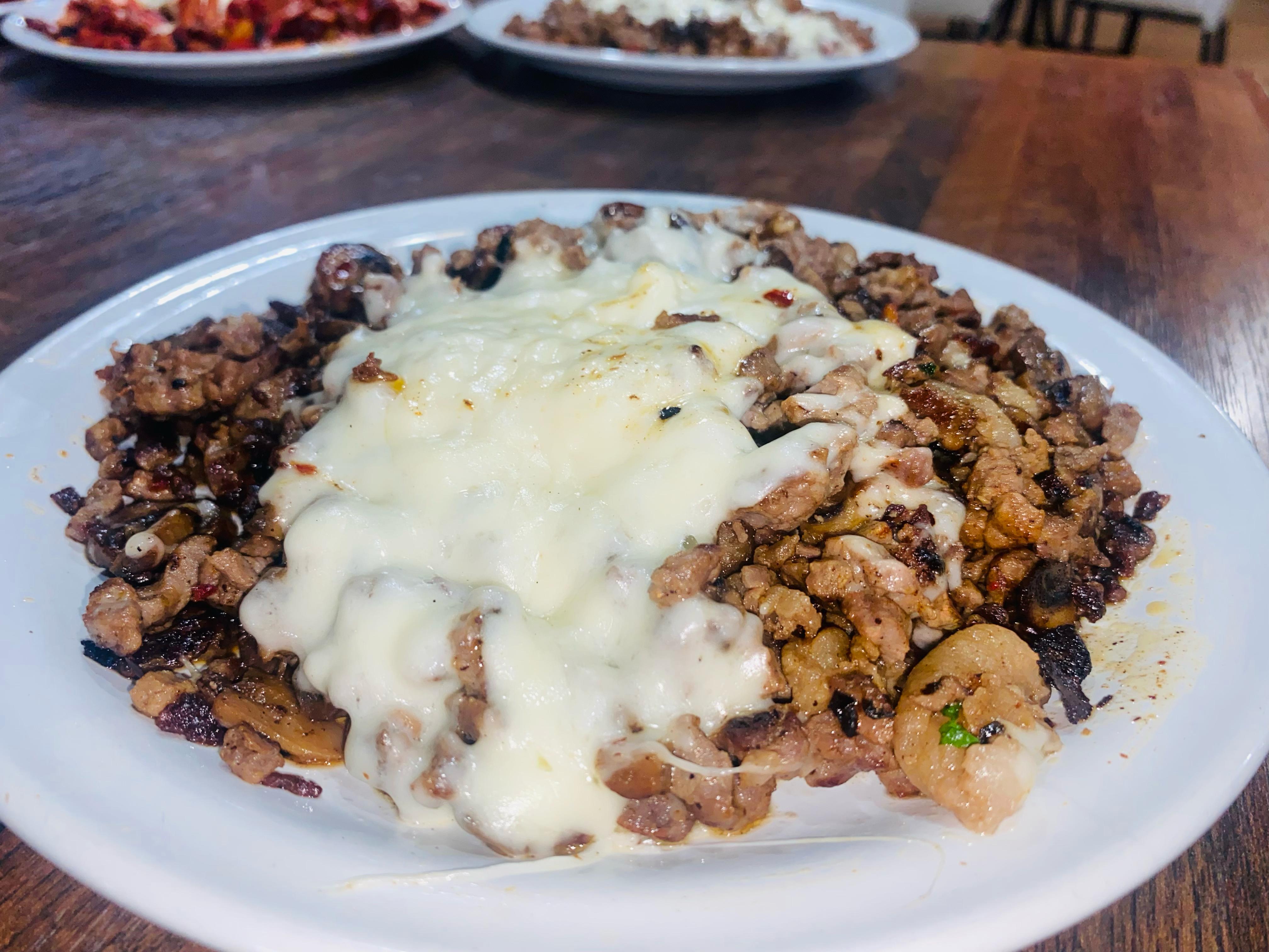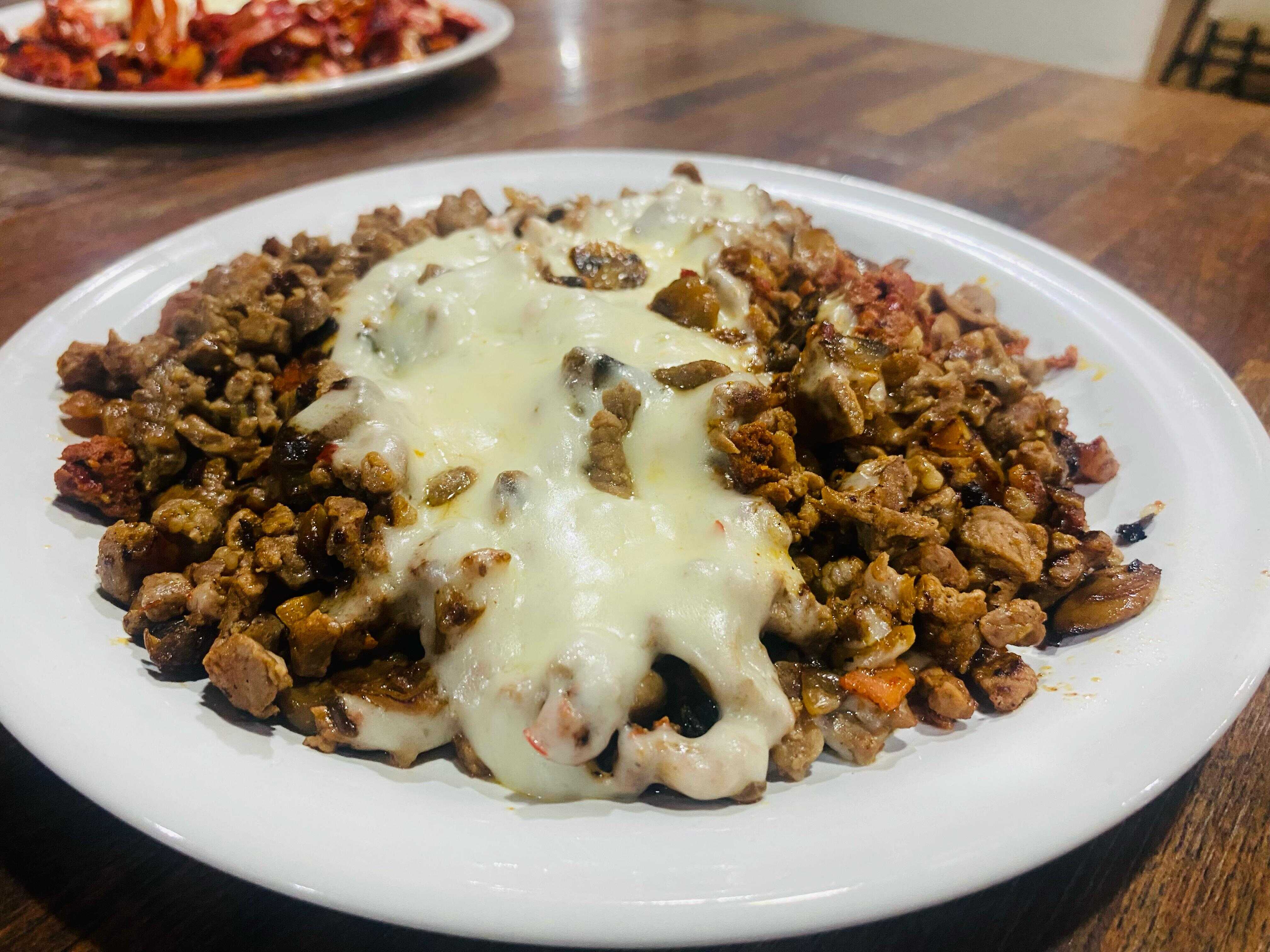 Bistec, chorizo, champiñones y queso.