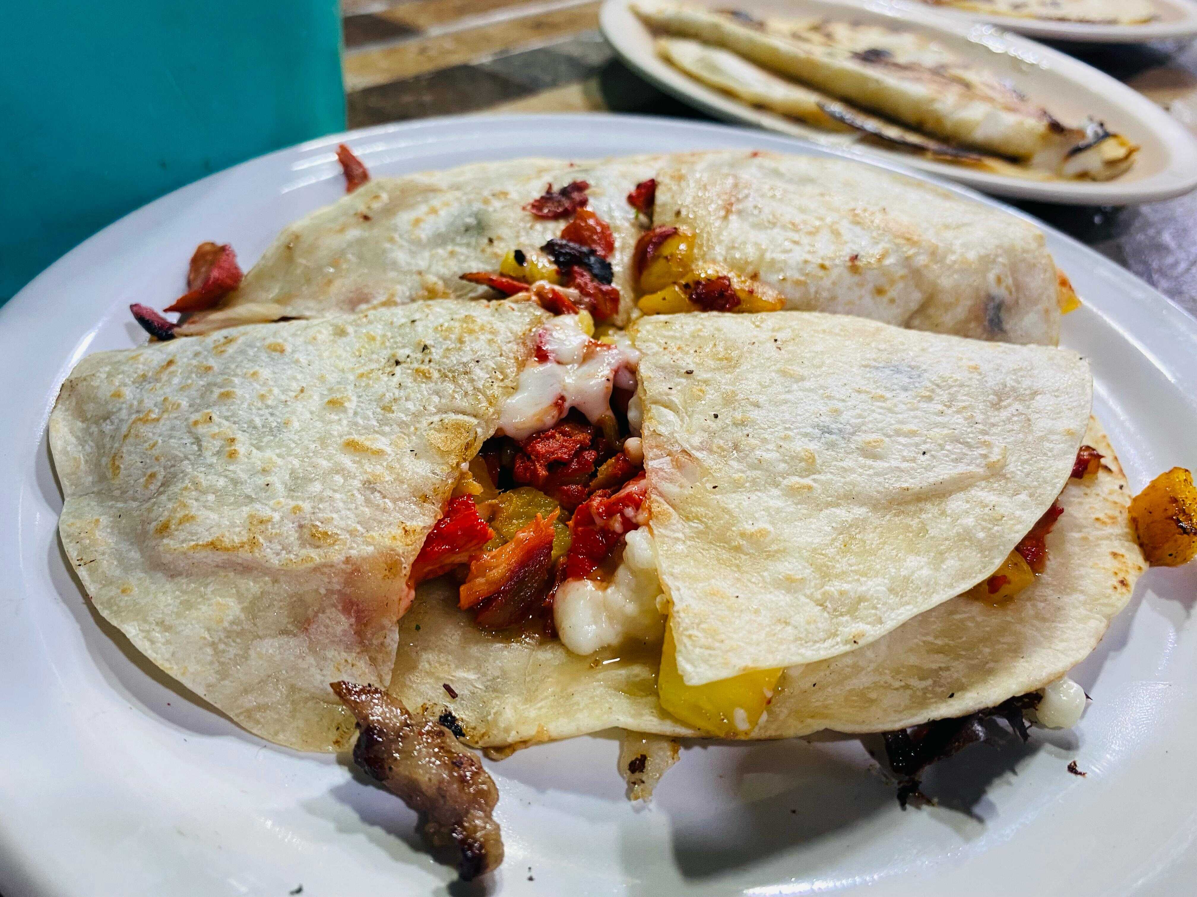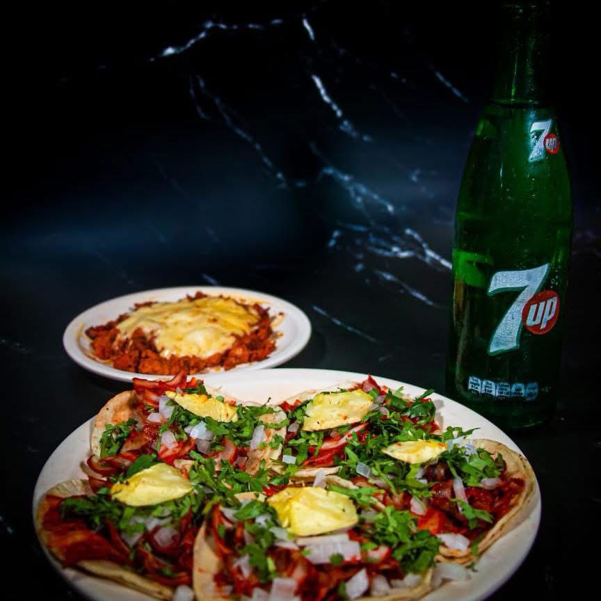 En dos tortillas de harina, pastor, piña y queso.