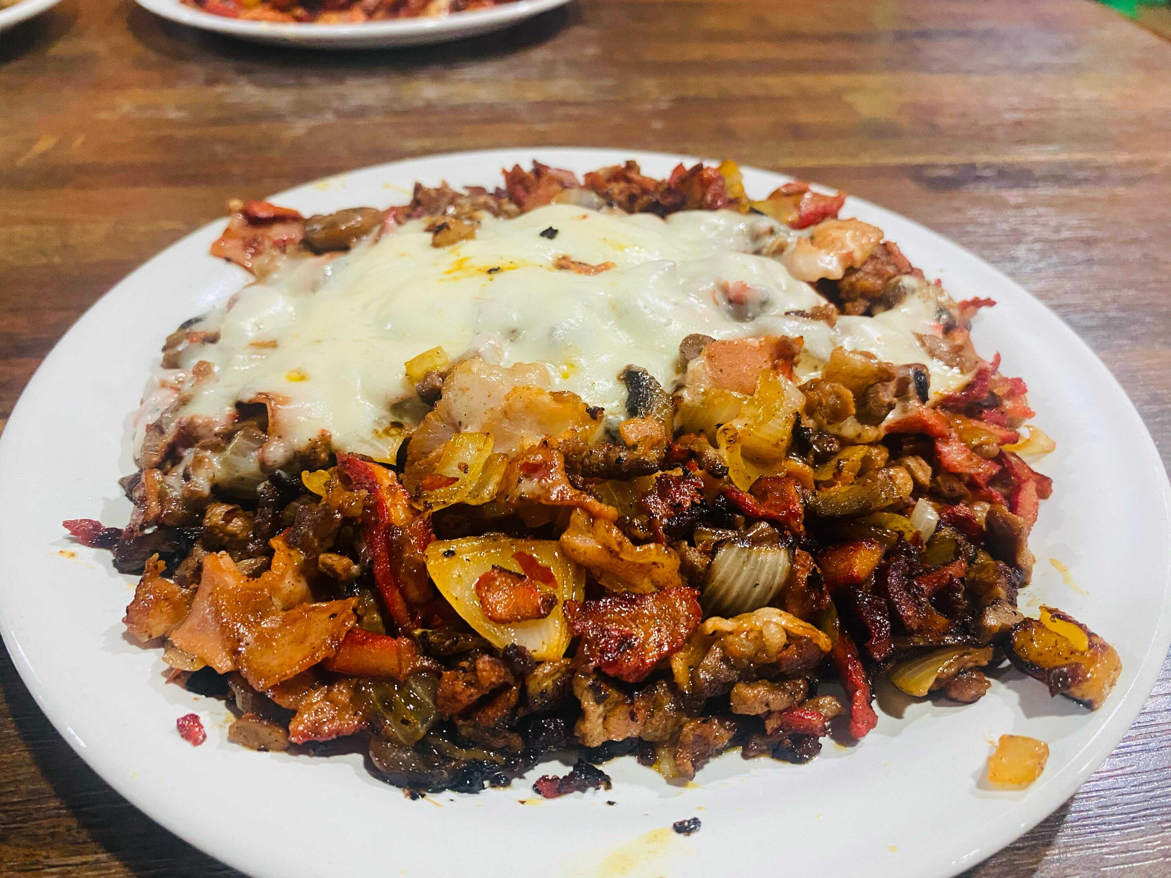 Pastor. Bistec, champiñones, tocino, chorizo, jamón, cebolla y queso,