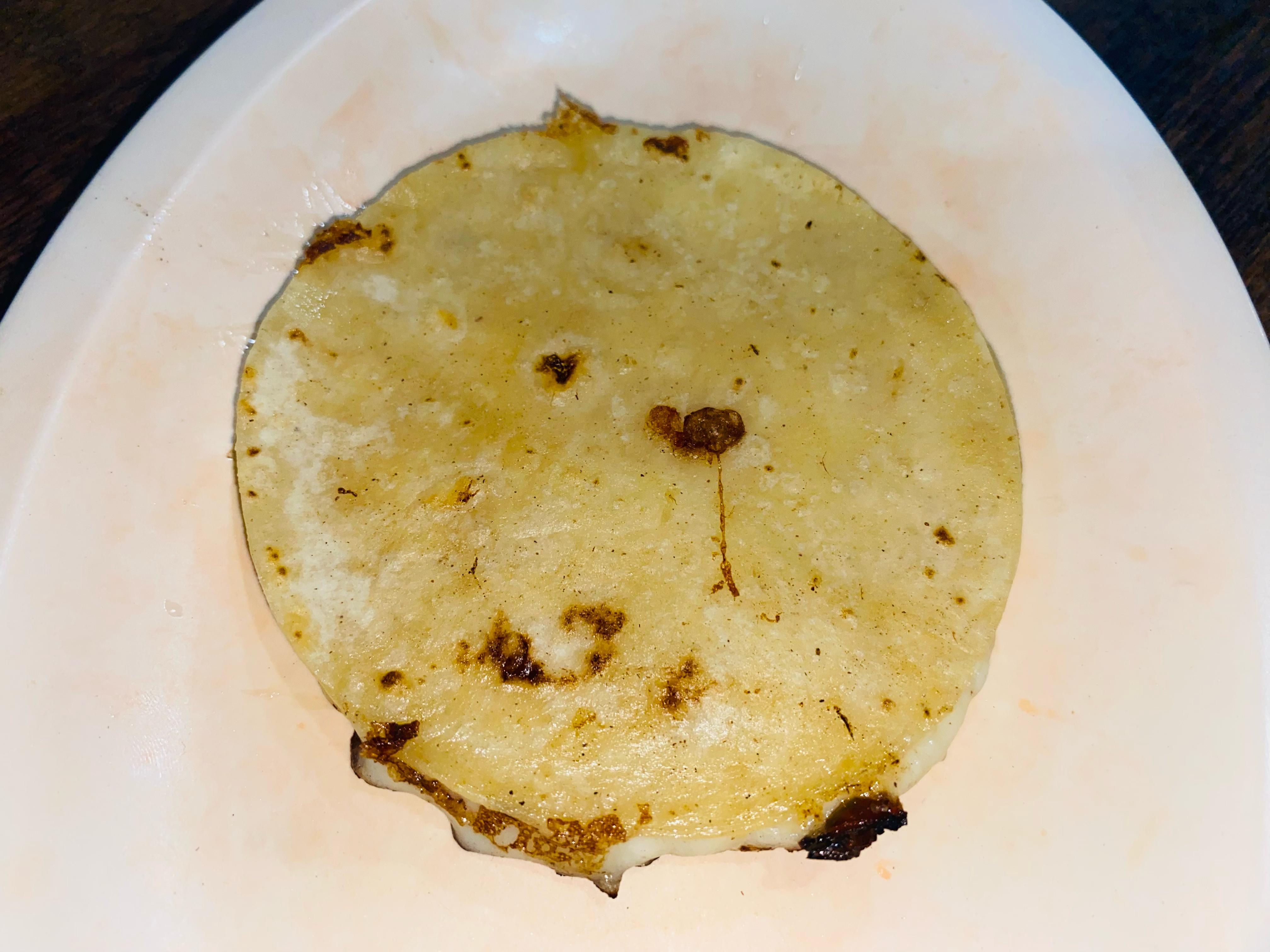 Tortilla de maíz tamaño mediano, con queso fundido,