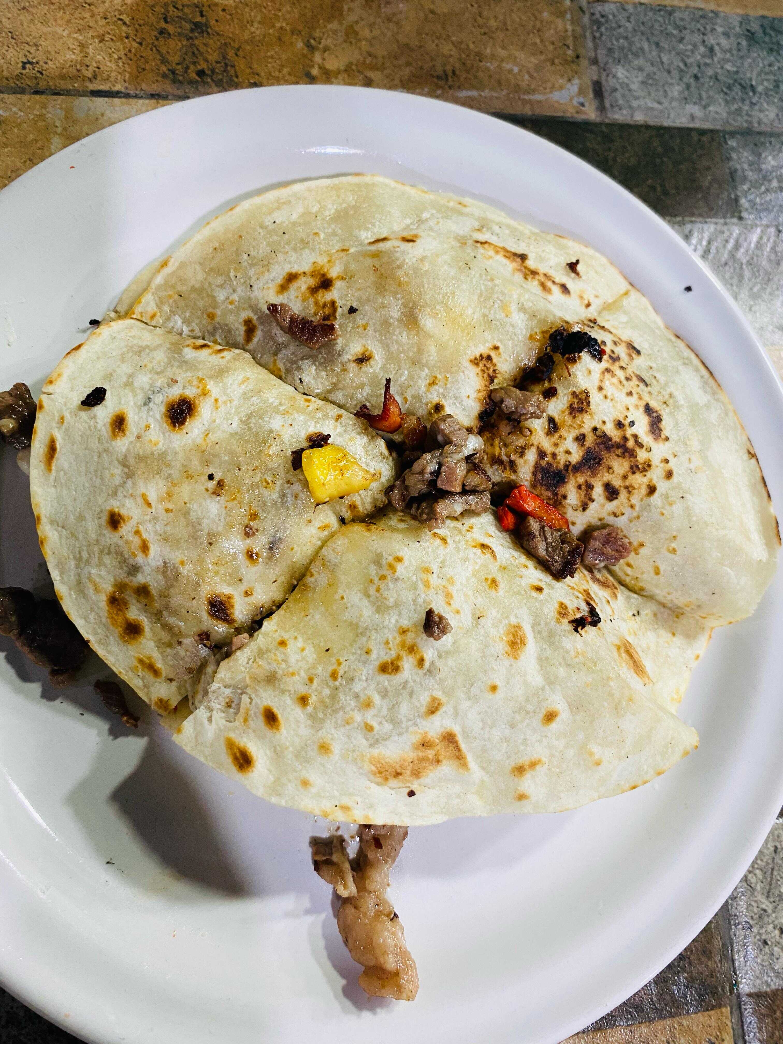 Bistec, piña y queso en dos tortillas de harina
