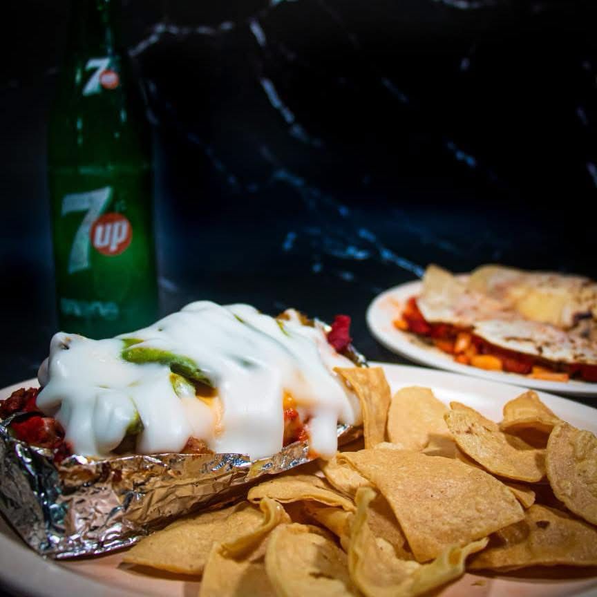 papa asada con carne de bistec, incluye totopos.