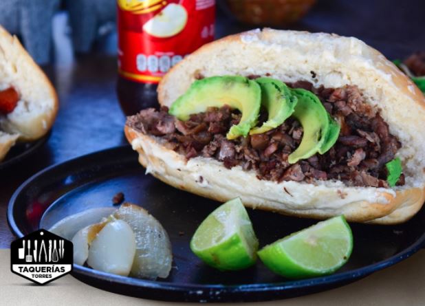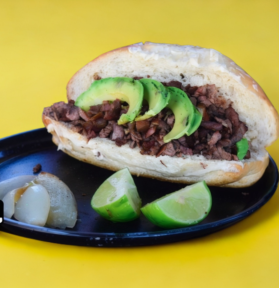 Pan de bolillo, mayonesa, bistec o trompo, cebolla, cilantro y aguacate. Acompañado de cebolla frita.