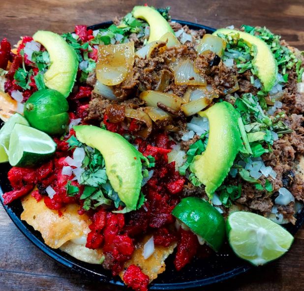Tostada con queso, carne, cebolla, cilantro y aguacate (Salsa y limones)