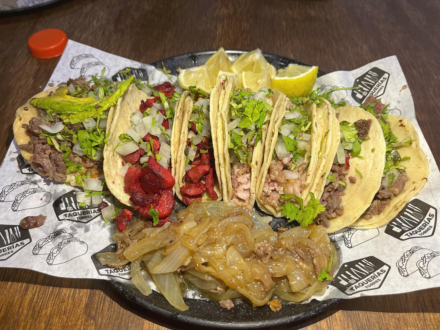 5 tacos de tripa acompañados de cebolla cruda, cilantro y cebolla asada