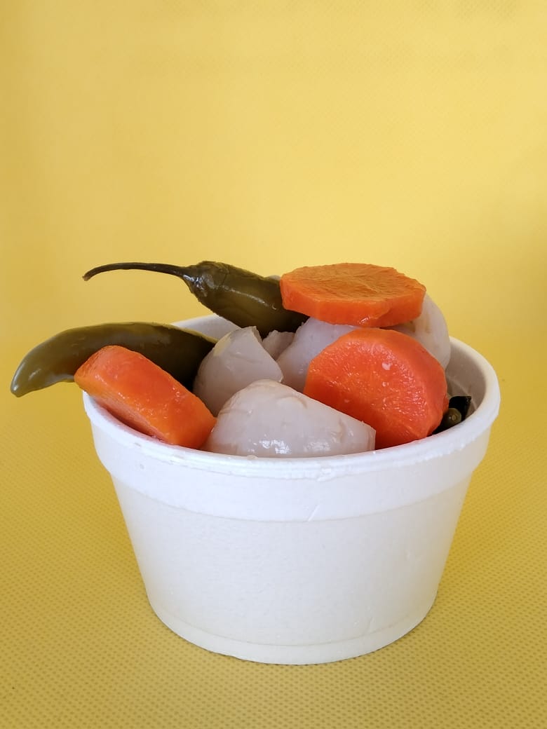 Vaso de cuero con su limón, zanahoria y chile.